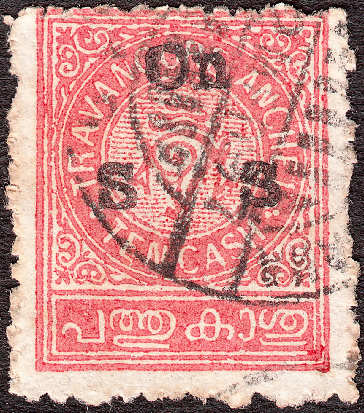 Die Freimarke MiNr. 23 zu 10 Cash in hellrot wurde mit schwarzem Aufdruck "On S S" versehen als Dienstmarke ausgegeben und als Tranvancore MiNr. D 10 katalogisiert: