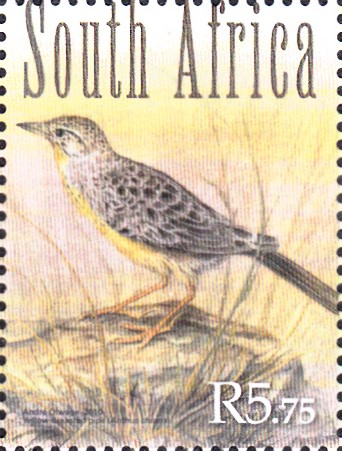 Auf dieser Marke aus Südafrika (MiNr 1981) wird uns ein Gelbbrustpieper (Anthus chloris) gezeigt.