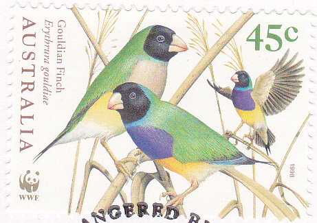 Die Gouldamadine (Chloebia gouldiae, Syn.: Erythrura gouldiae) gehört zur Familie der Prachtfinken (Estrildidae). Die Finken zählen zur Fauna Australiens und sind eine polymorphe Art. In der gleichen Population kommen meist zwei, gelegentlich sogar drei in der Färbung des Oberkopfes verschiedene Variationen nebeneinander vor. Sie verpaaren sich ohne Einschränkung untereinander, so dass sie nicht als Unterarten unterschieden werden. Die Körperlänge der Vögel beträgt bei beiden Geschlechtern etwa elf Zentimeter. Vom Kopf bis zu den Enden der beiden mittleren Schwanzfedern beträgt ihre Länge zwischen 13 und 15 Zentimeter.