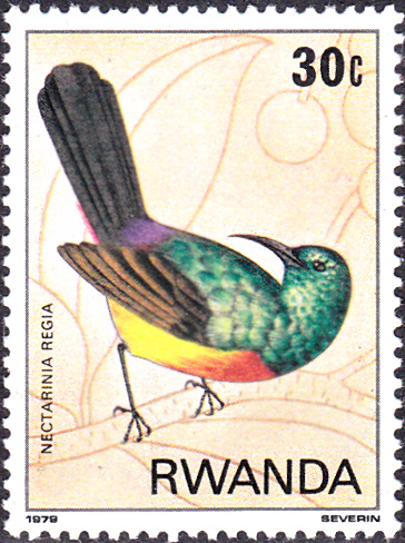 In Kenia ist diese Marke (MiNr 581) mit einem Rotbrust-Glanzköpfchen (Chalcomitra senegalensis, Syn.: Nectarinia senegalensis)m erschienen. Michel nennt als Name Rotbrustnektarvogel (Nectarinia senegalensis).