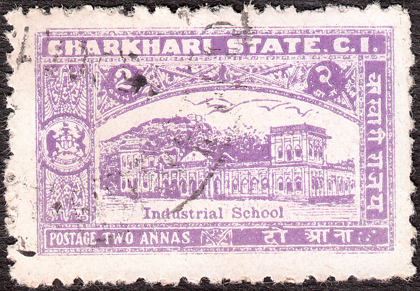 Am 23.06.1931 erschien innerhalb eines Satzes von 9 Werten diese Freimarke zu 2 Annas in Violett, die als Motiv "Industrial School" = Industrieschule zeigt: