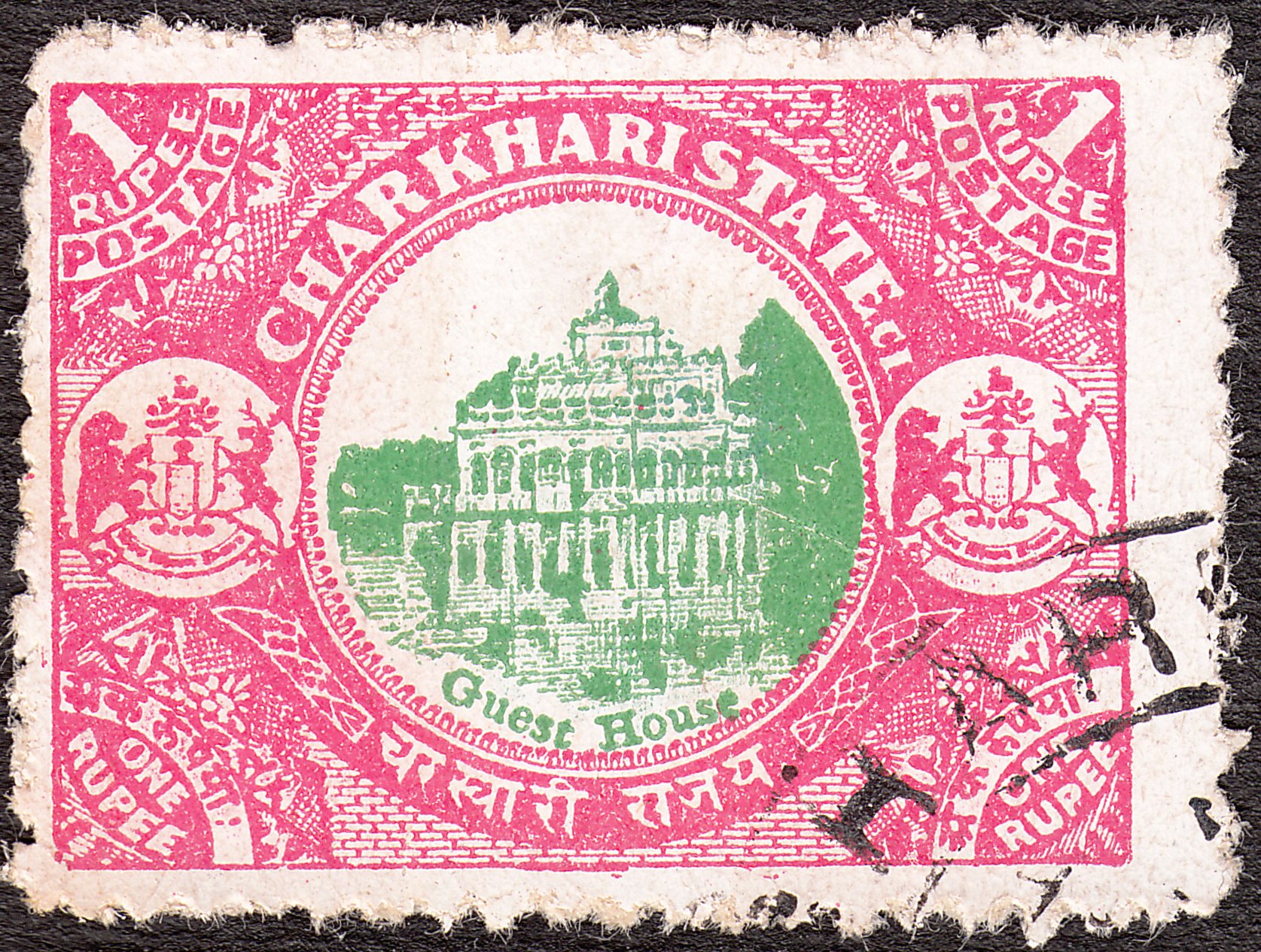 Diese Freimarke zu 1 Rupie in rosa/grün mit dem Motiv "Guest House" = Gästehaus erschien am 23.06.1931 und ist katalogisiert als Charkhari MiNr. 27: