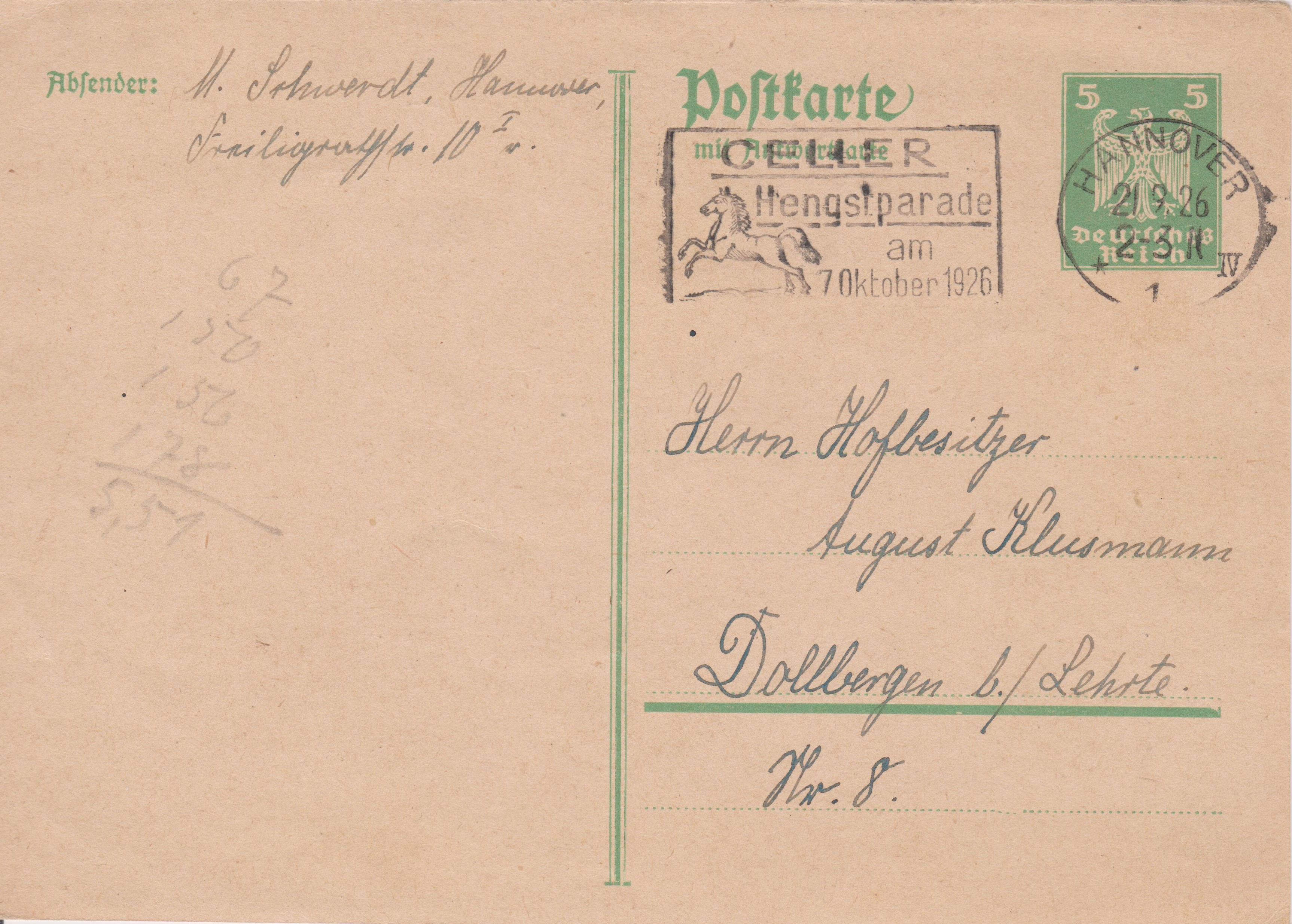 Frageteil einer Postkarte mit Antwortkarte, Deutsches Reich P 163 I F, am 21.09.1926 adressiert nach "Dollbergen bei Lehrte" aufgegeben in HANNOVER, entwertet per Maschinenstempel mit Werbeeinsatz "CELLER Hengstparade am 7. Oktober 1926":