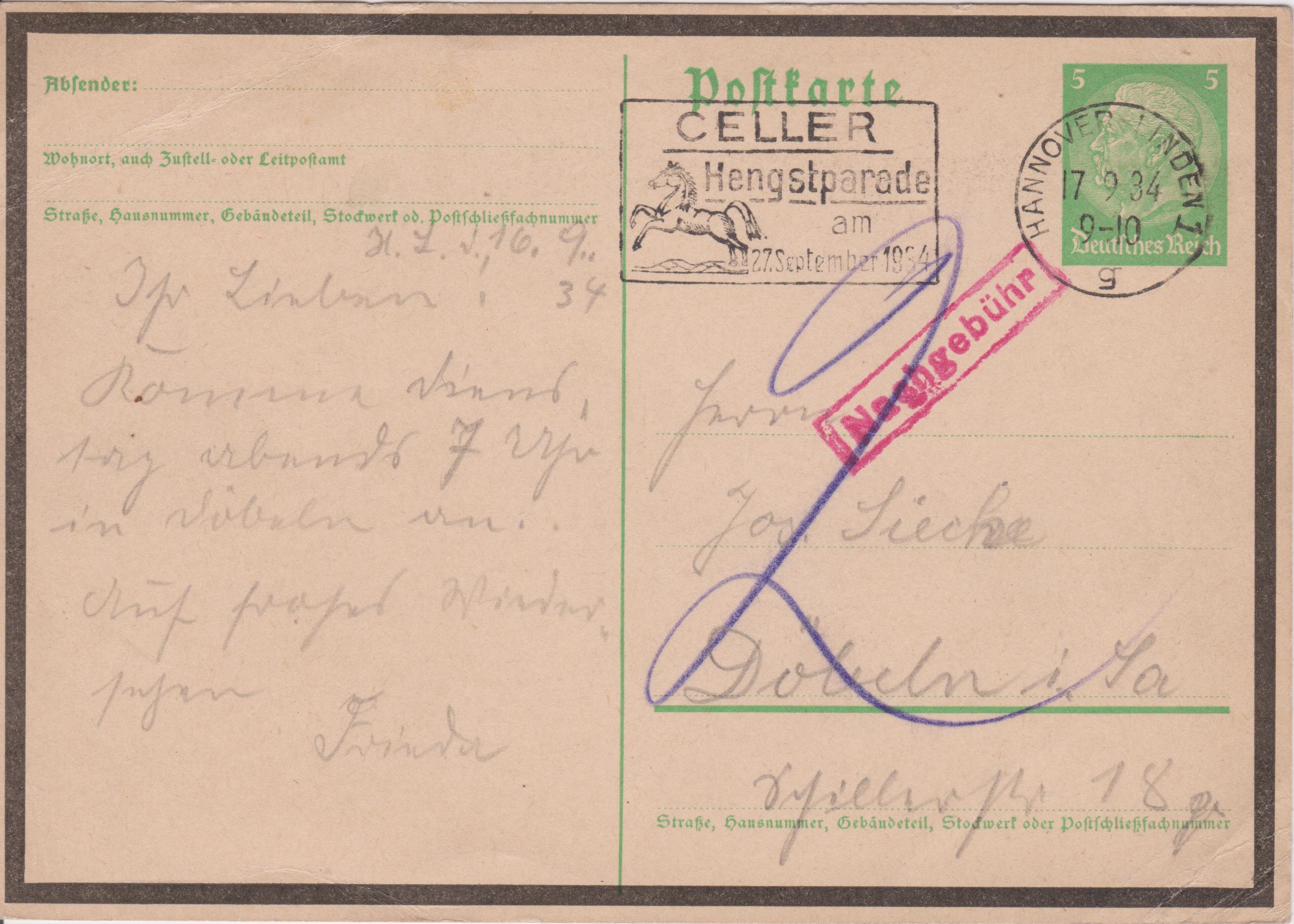 Postkarte mit eingedrucktem Postwertzeichen 5 Pf Dauerserie Hindenburg, als Postkarte im Fernverkehr, Portostufe 6 Pf, gebraucht am 17.09.1934 ab Hannover nach Döbeln in Sachsen: