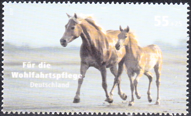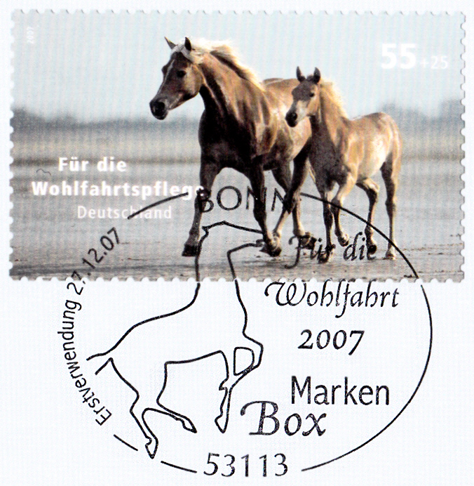 In der Wohlfahrtsmarkenserie 2007 zum Thema "Haustiere" erschien diese Marke (MiNr 2631) mit zwei Pferden.