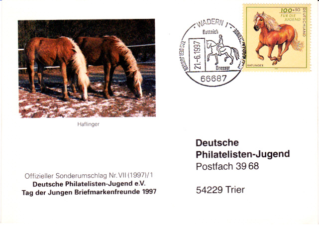 Der Sonderstempel zum Tag der Jungen Briefmarkenfreunde 1997 aus 66687 Wadern 1 vom 21.6.1997 zeigt ein Pferd mit Reiter beim Dressurreiten.