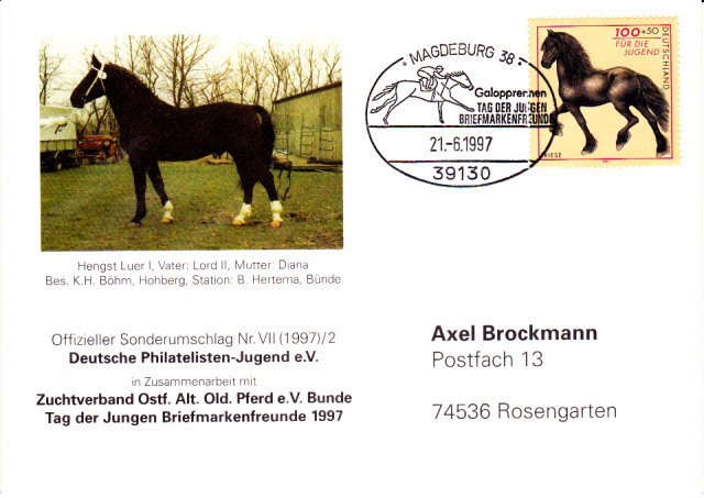 Zum Tag der Jungen Briefmarkenfreunde in Magdeburg gab es am 21.6.1997 einen Sonderstempel mit der bildlichen Darstellung eines Reiters beim Galopprennen.