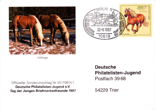 Der Sonderstempel zum Tag der Jungen Briefmarkenfreunde aus 10619 Berlin 12 vom 22.6.1997 zeigt uns einen Fahrer im Sulky bei einem Trabrennen.