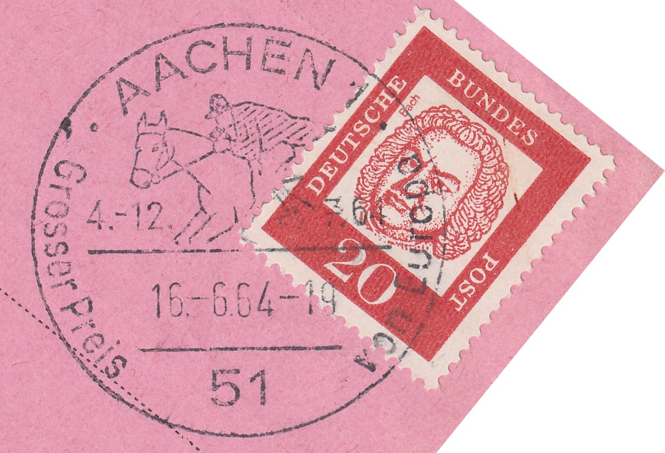 Interessant ist der zur Entwertung verwendete Maschinenstempel mit Werbeeinsatz "BAD AACHEN INTERNAT. TURNIER UND PFERDESCHAU 16.-28.JULI", der die Silhouette eines Springreiters zeigt.
