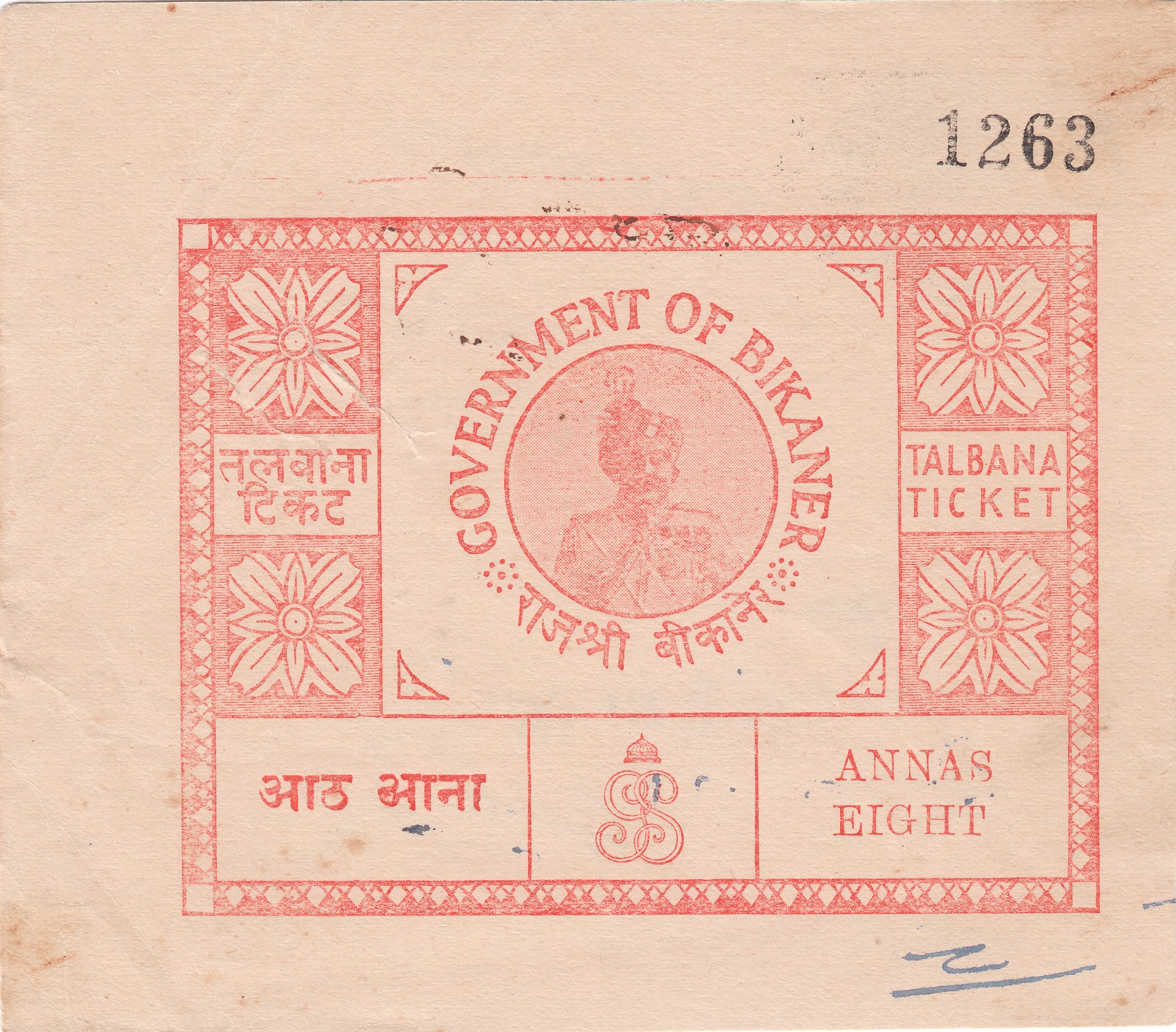 GOVERNMENT OF BIKANER - TALBANA TICKET - 8 ANNAS