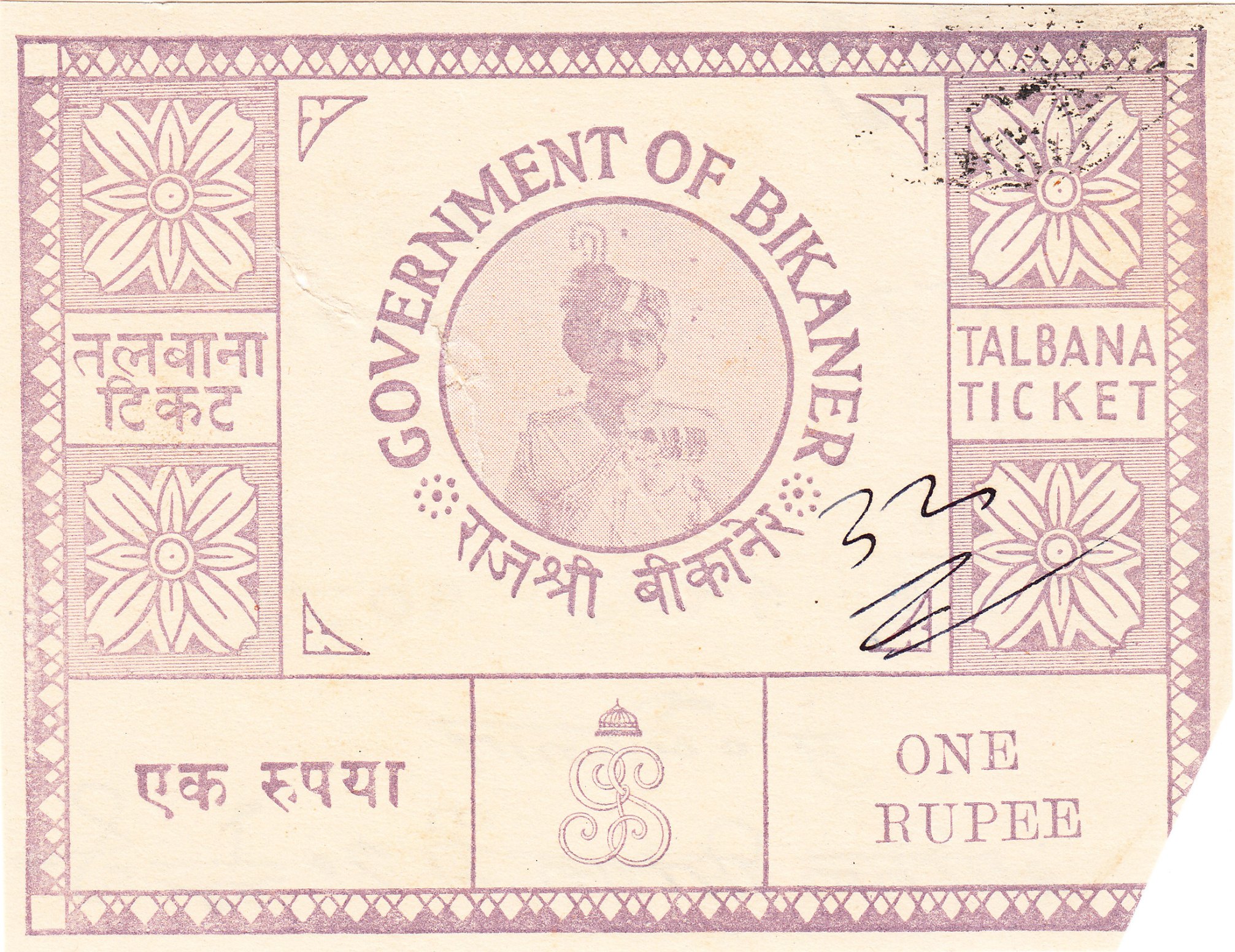 GOVERNMENT OF BIKANER - TALBANA TICKET - 1 RUPEE