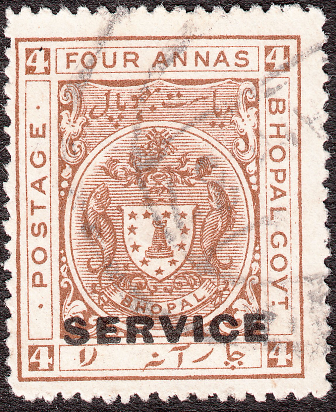 Von 1908 bis 1949 erschienen in Bhopal insgesamt 49 verschiedene Dienstmarken.