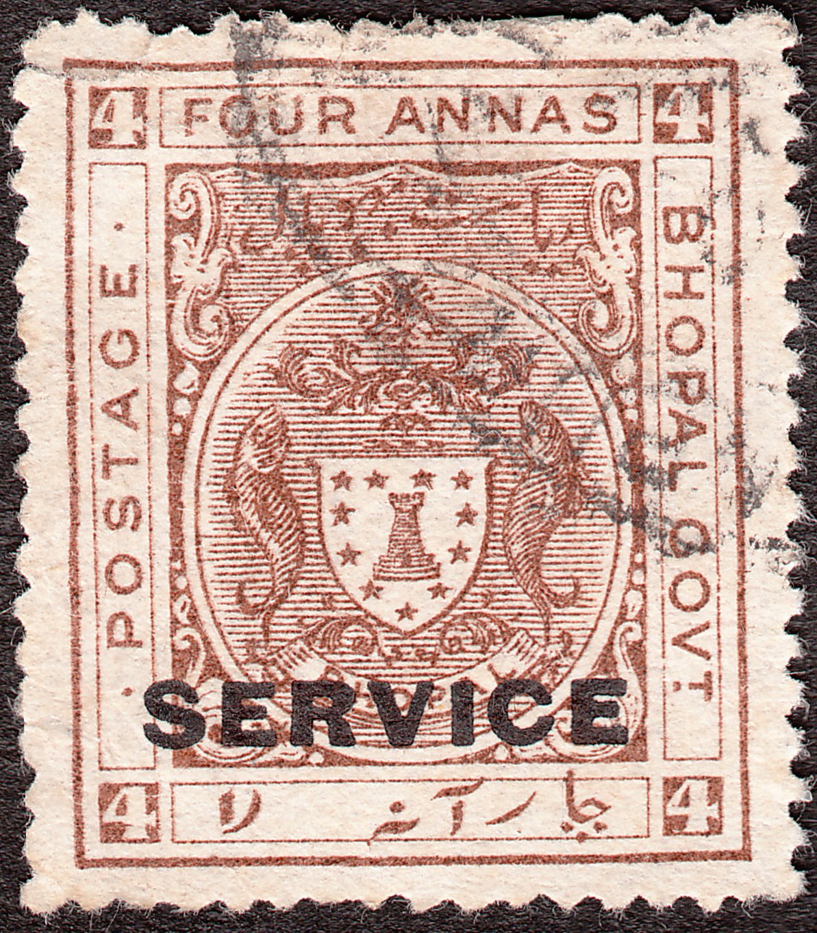 Diese Marke zu 4 Annas in lilabraun erschien mit Inschrift links "POSTAGE" sowie rechts "BHOPAL GOVT" = Government und ist katalogisiert als Bhopal MiNr. D 13: