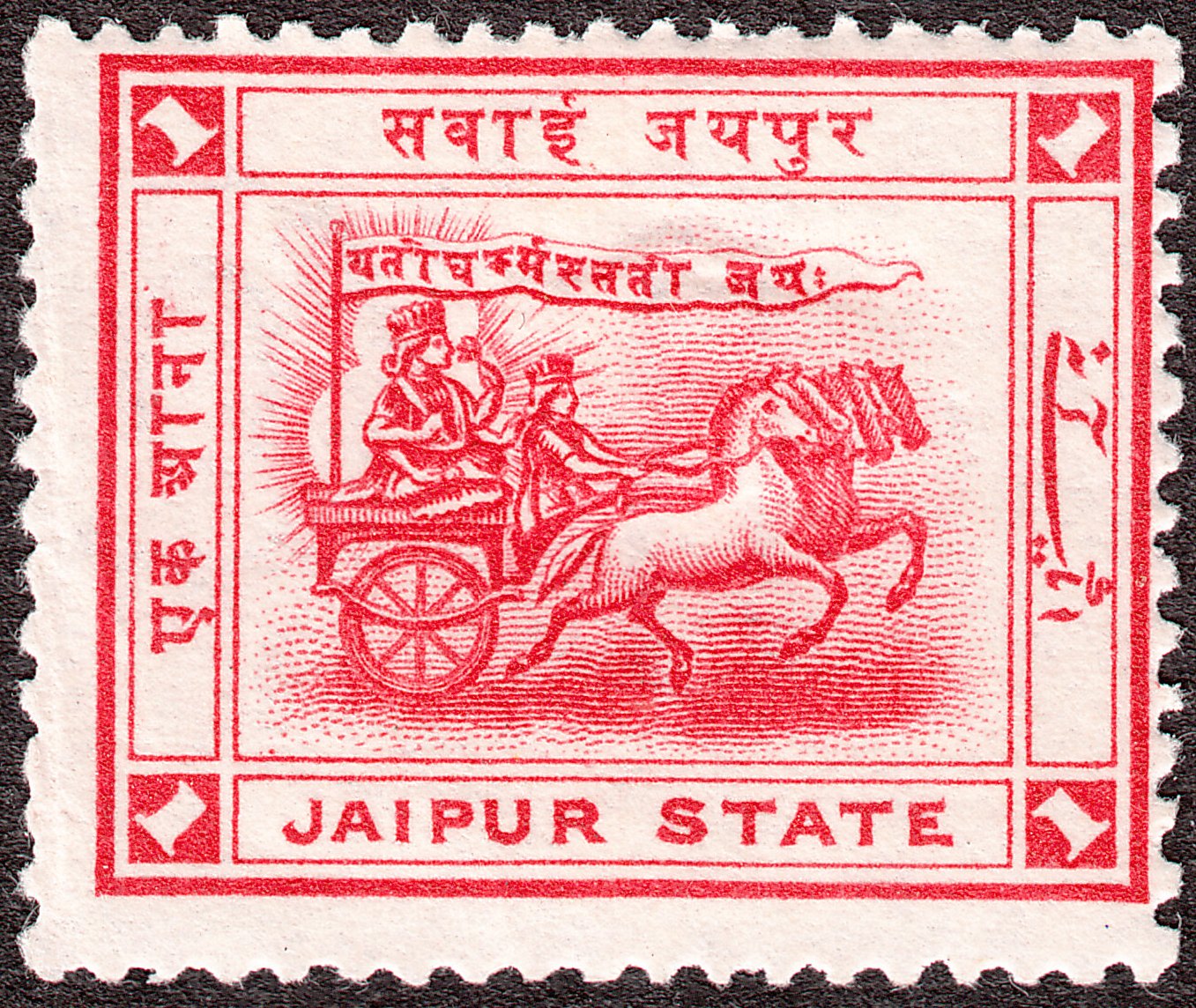 Diese Freimarke zu 1 Anna in hochrot zeigt einen Sonnenwagen, gezogen von der siebenköpfigen Stute "Utschislas", obere Inschrift in Hindi "Sawai Jaipur", links und rechts Wertangabe in Hindi und Urdu: