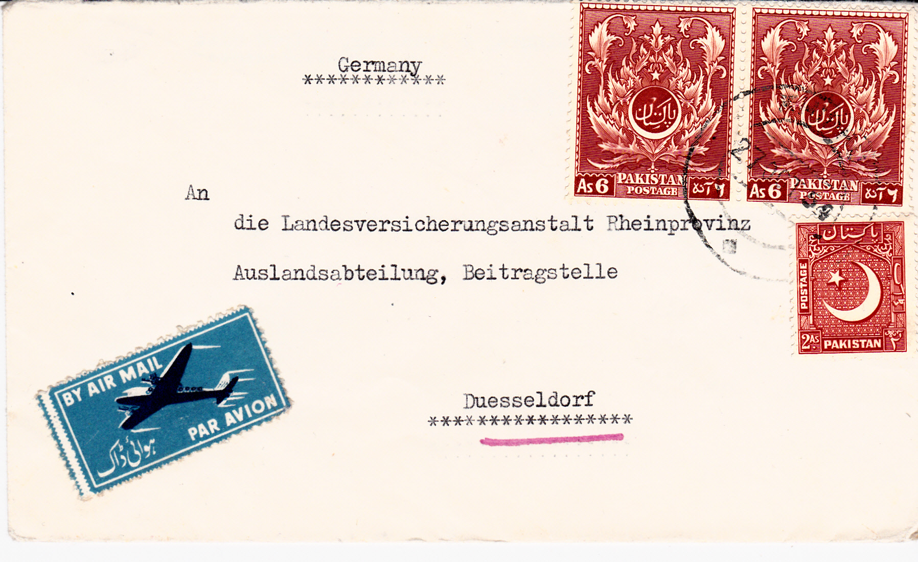 Auf diesem Brief mit Luftpost nach Düsseldorf wurden zwei Marken zu 6 Annas der Freimarkenserie "4 Jahre Unabhängigkeit" (MiNr 59) und eine Marke zu 2 Annas mit dem Staatsemblem Halbmond (mit Stern) in zunehmender Phase (MiNr 49) verklebt.
