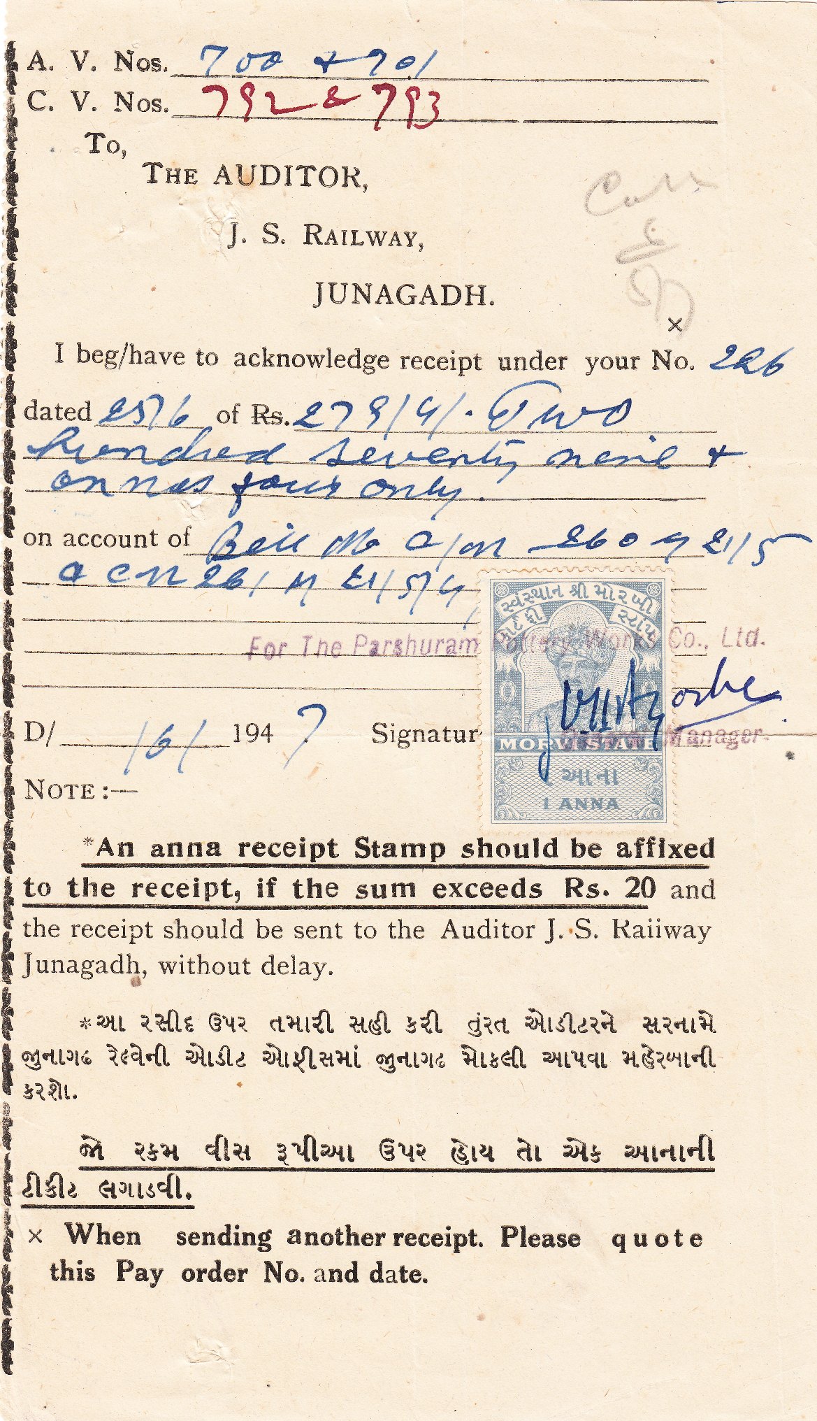 Dieser Beleg aus dem Jahre 1947 trägt eine Gebührenmarke zu 1 Anna in blau: