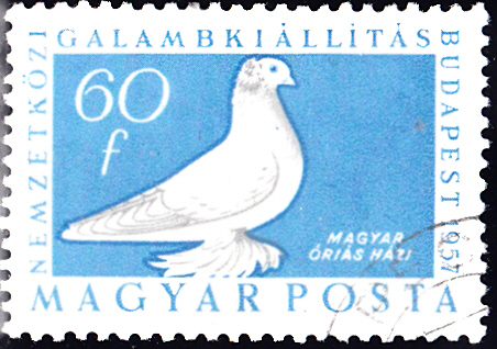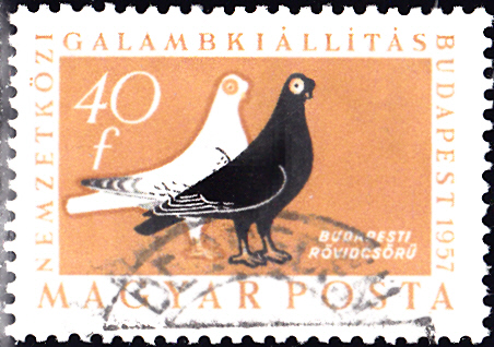 Tauben der Rasse "Budapester Kurze" zeigt diese Marke aus Ungarn (MiNr 1506 A).