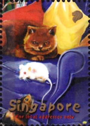 Auf dieser Marke aus Singapur (MiNr 1057) sehen wir eine Braune Katze und eine weiße Maus.
