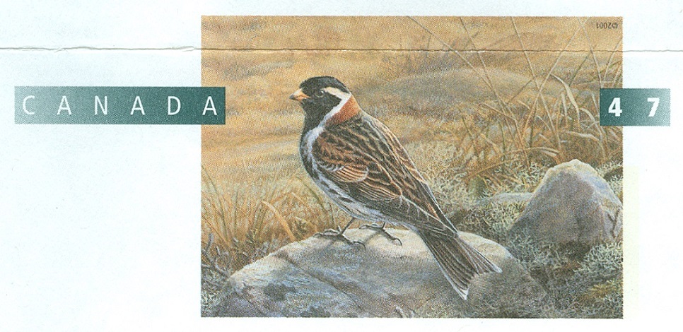 Eine weitere der kanadischen Ganzsachen erschien 2001 und zeigt ein männliches Exemplar der Spornammer, einen Wintergast in Deutschland.