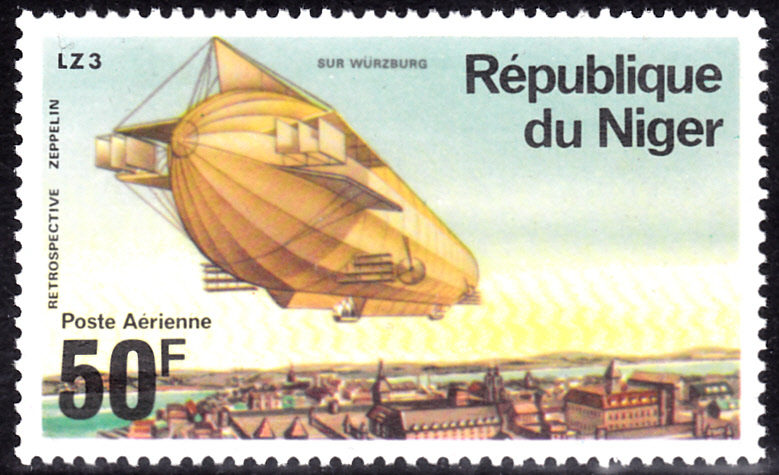 Auf dieser Marke aus dem Niger (MiNr 523) wird LZ 3 über Würzburg gezeigt.