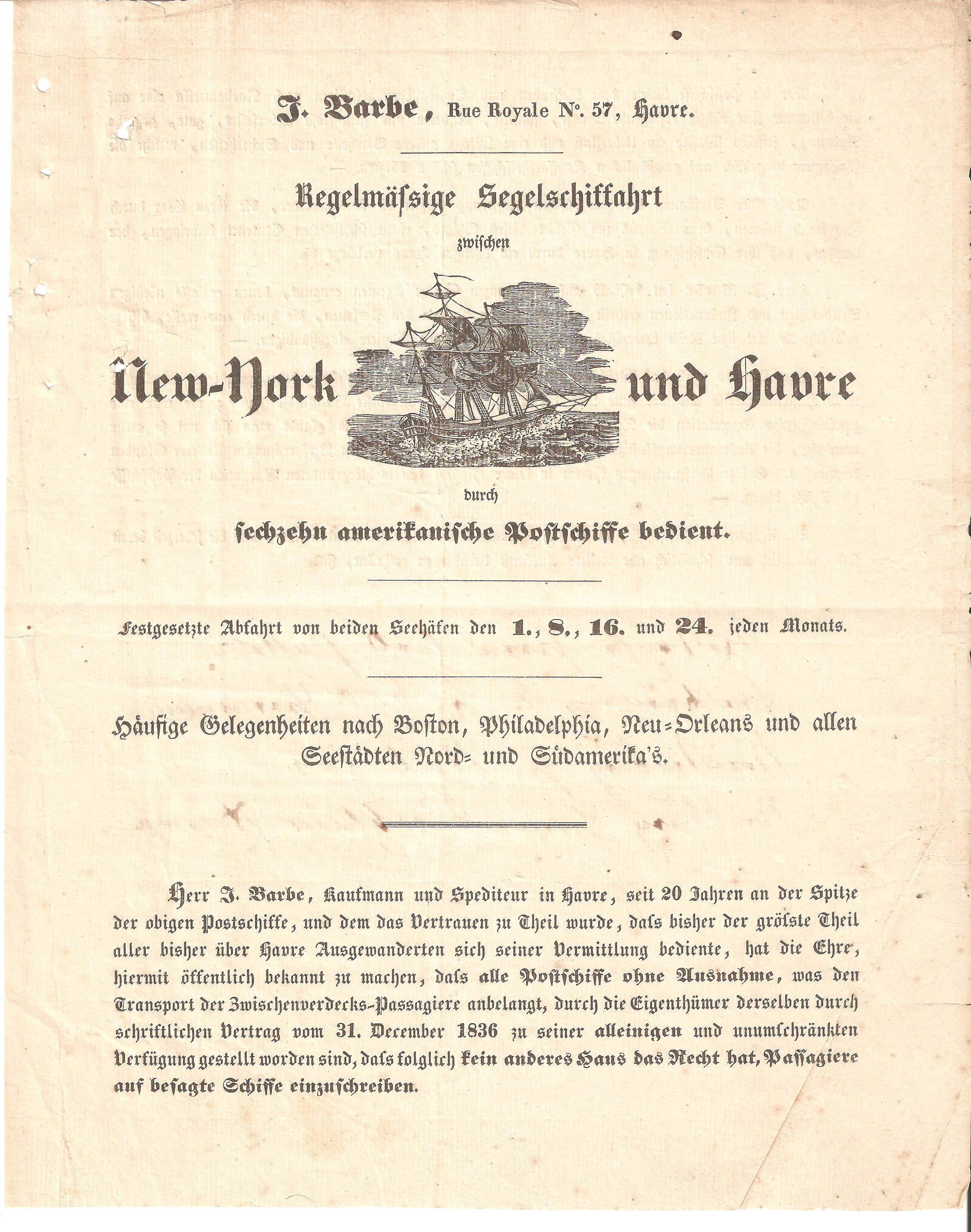 Den Anfang mach ich mit einem interessanten zeitgeschichtlichen Dokument. Hierbei handelt es sich um eine Werbung von ca. 1840 der Firma J. Barbe in Le Havre. Diese wirbt darin für ihr 16 Schiffe die zwischen Le havre und den USA vier mal im Monat verkehren und Post transportieren und Auswanderer nach Amerika bringen.
