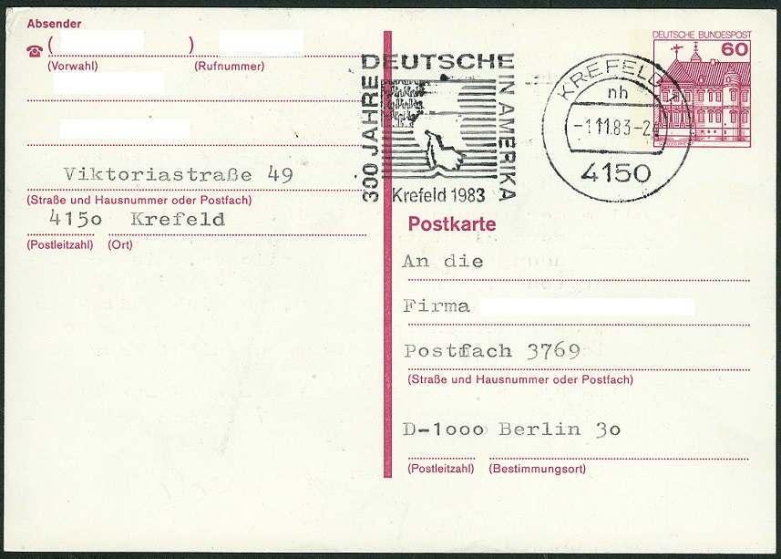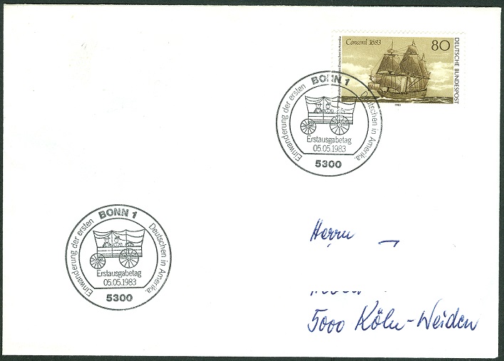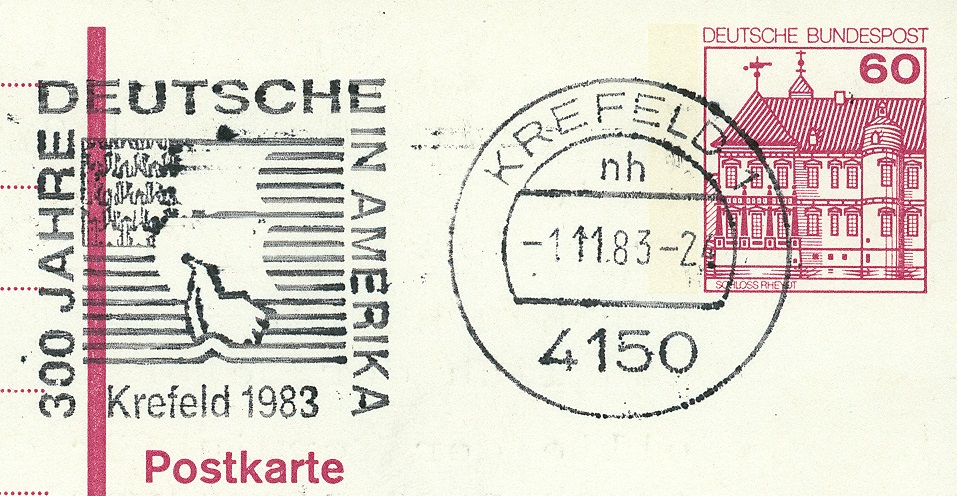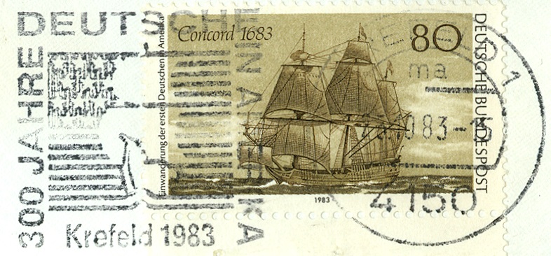 Ein zum Motiv passender Krefelder Maschinenstempel und die 1983 verausgabte "Concord".