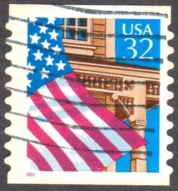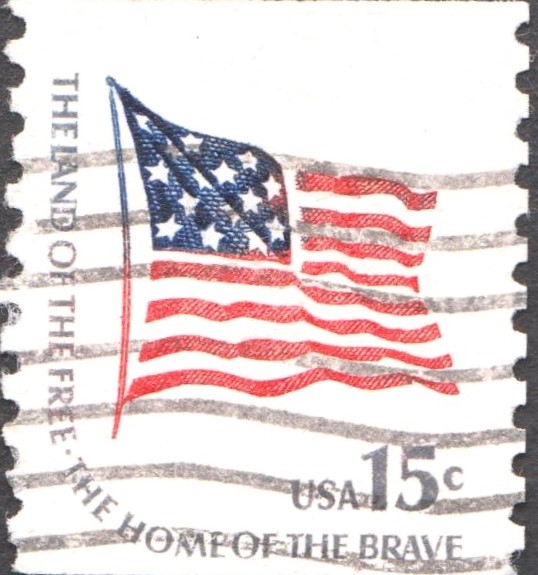 Auf dieser Freimarke, USA MiNr. 1352 C, flattert die historische Nationalflagge (1799-1818) im Wind: