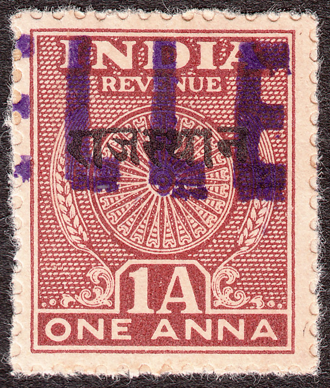 Diese 1948 erschienene Gebührenmarke aus Indien mit schwarzem Aufdruck Rajasthan in Devanagari wurde katalogisiert als KM RV2A: