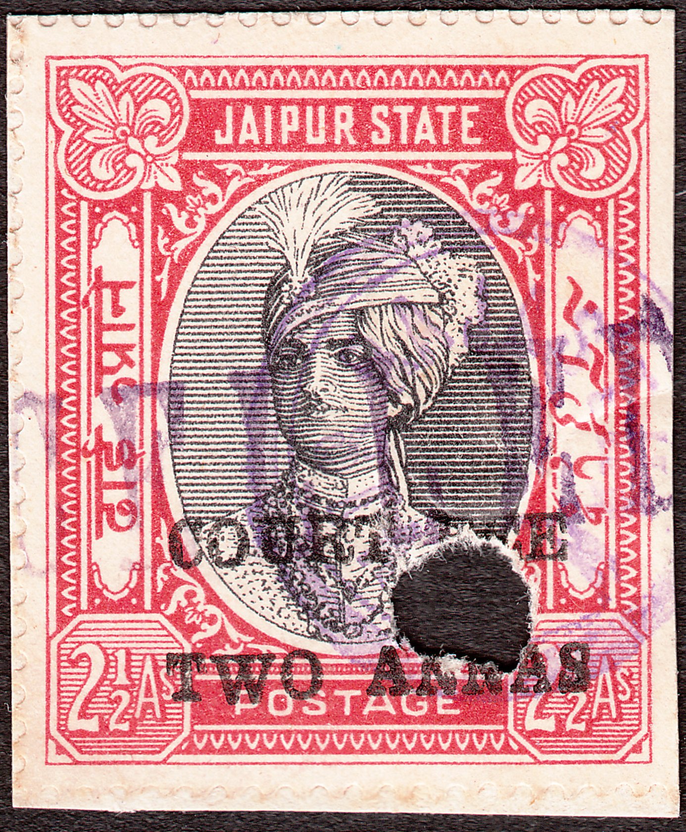 Diese Gebührenmarke aus Jaipur mit zweizeiligem schwarzem Aufdruck COURT FEE 2 ANNAS auf Freimarke Jaipur MiNr. 38 zu 2 1/2 Annas in Type 15 zeigt als Motiv Maharadscha Sir Sawai Man Singhji Bahadur und ist katalogisiert als KM 162a: