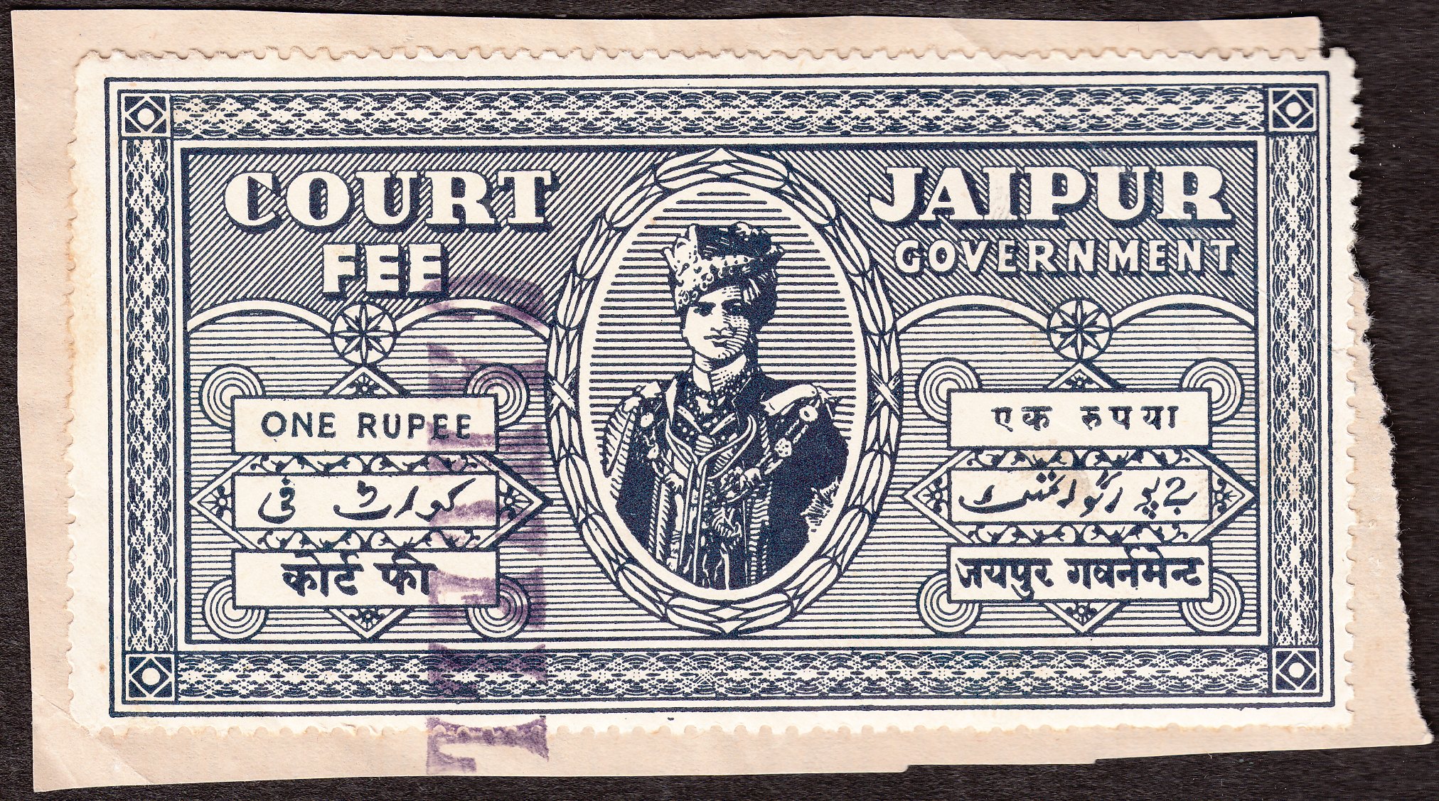 Diese Gebührenmarke "COURT FEE" aus Jaipur in Type 10 zu 1 Rupie in schwarz auf Briefstück zeigt Maharadscha Sir Sawai Man Singhji Bahadur: