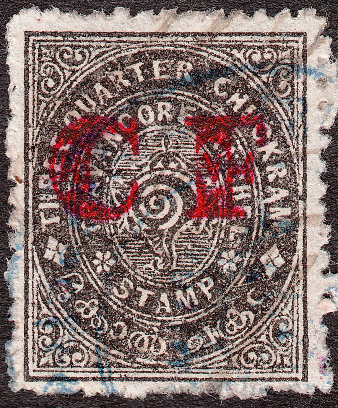 Die Freimarke Travancore MiNr. 5 zu 3/4 Chukram in schwarz wurde mit rotem Aufdruck "C F" = Court Fee als Gebührenmarke ausgegeben:
