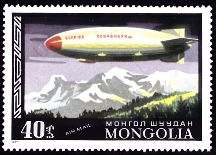 Auf einer Marke aus der Mongolei (MiNr 1120) wird das Luftschiff UdSSR-W6 "Ossoawiachim" gezeigt.