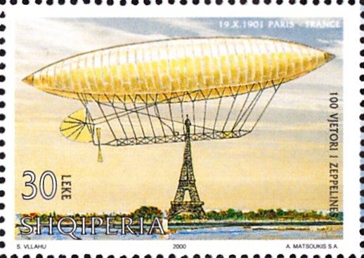 Diese Marke aus Albanien (MiNr 2772) zeigt das Luftschiff Nr 6 von Alberto Santos Dumont über Paris am 19.10.1901.