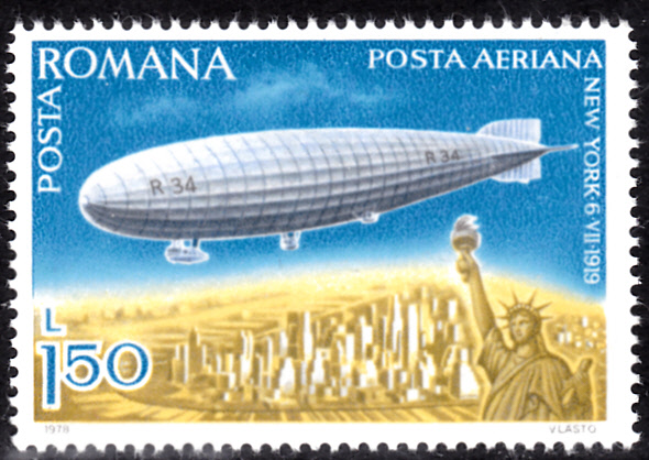 Auf dieser Marke aus einer Serie "Luftschiffe" aus Rumänien (MiNr 3501) ist das Luftschiff R 34 über New York zu sehen.