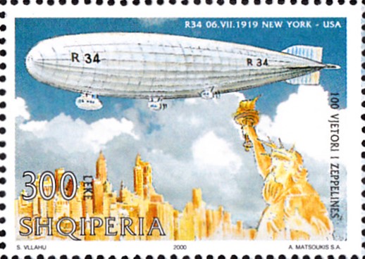 Diese Marke aus Albanien (MiNr 2773) zeigt das Luftschiff R 34 am 6. Juli 1919 bei New York.