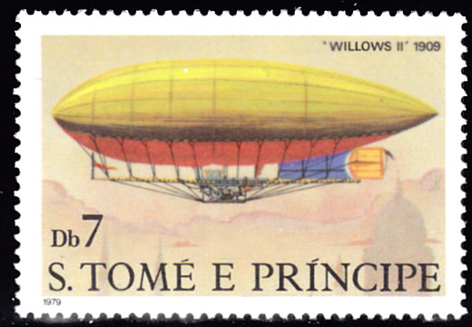 Auf dieser Marke aus Sao Tomé und Principe (MiNr 629) zeigt das Luftschiff Willows 2 aus dem Jahre 1909.