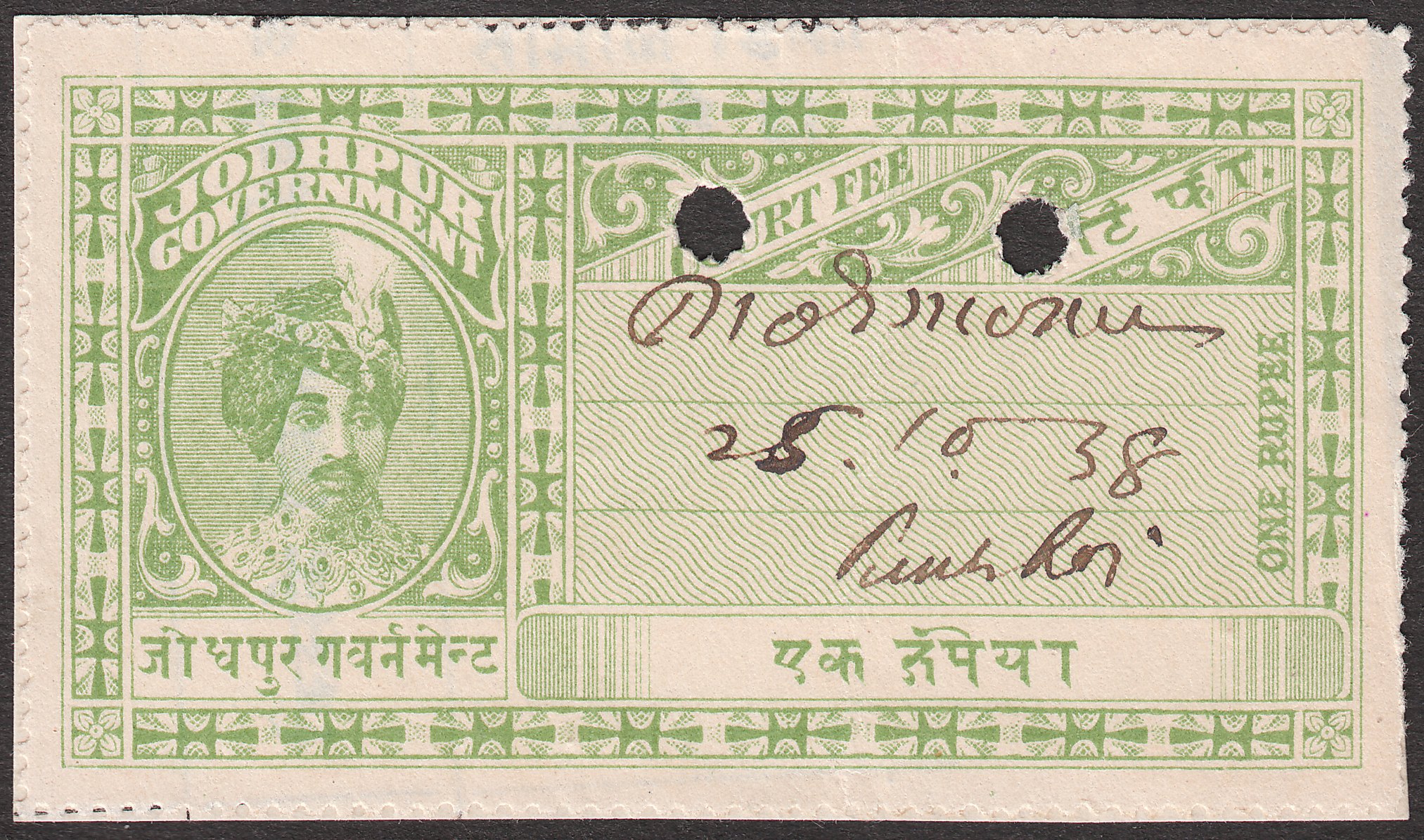 Diese Gebührenmarke "COURT FEE" in Type 5 zu 1 Rupie in grün zeigt als Motiv Maharadscha Umed Singh: