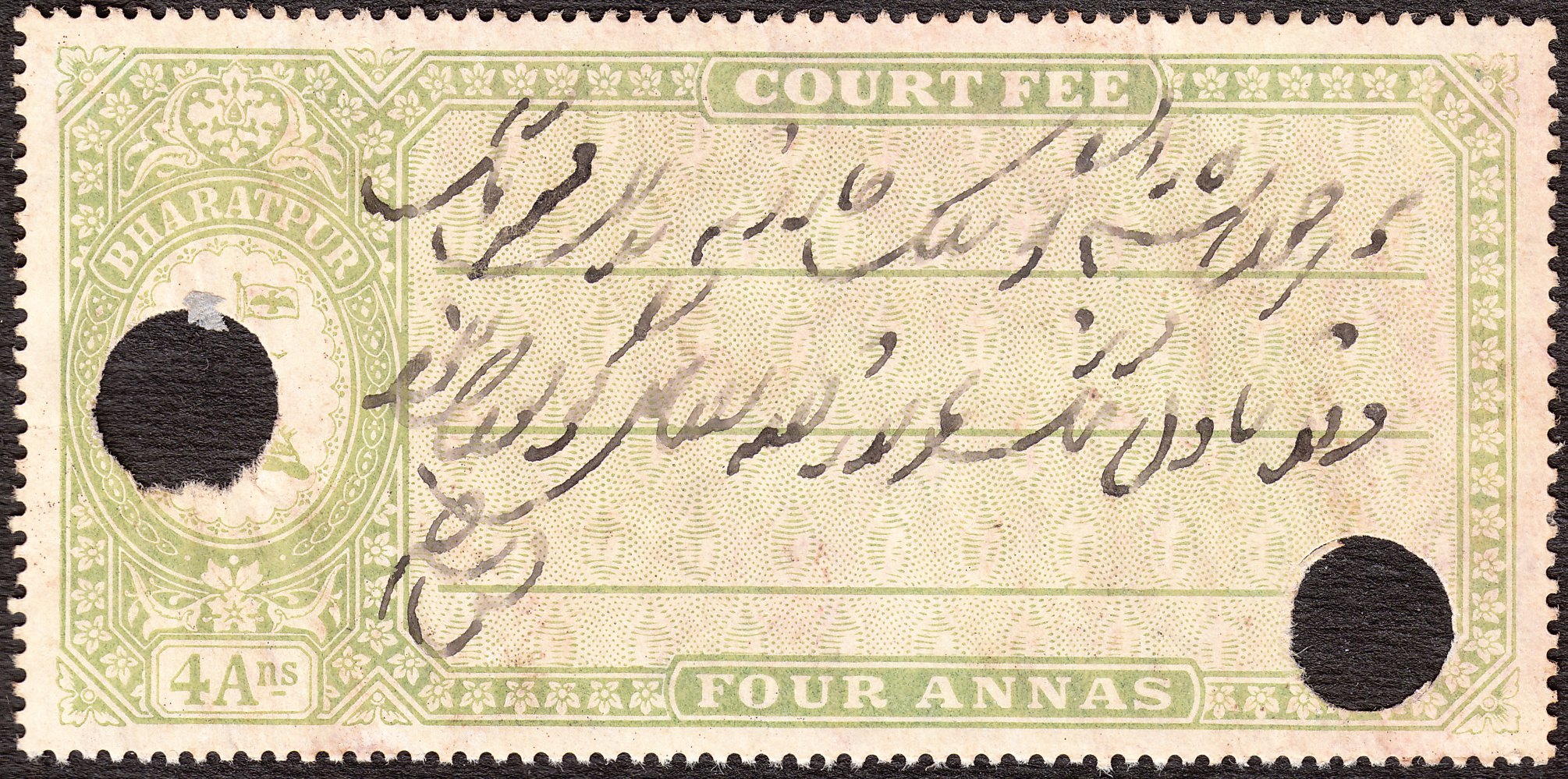 Hier eine in Bharatpur erschienene Gebührenmarke "COURT FEE" zu 4 Annas in Type 4: