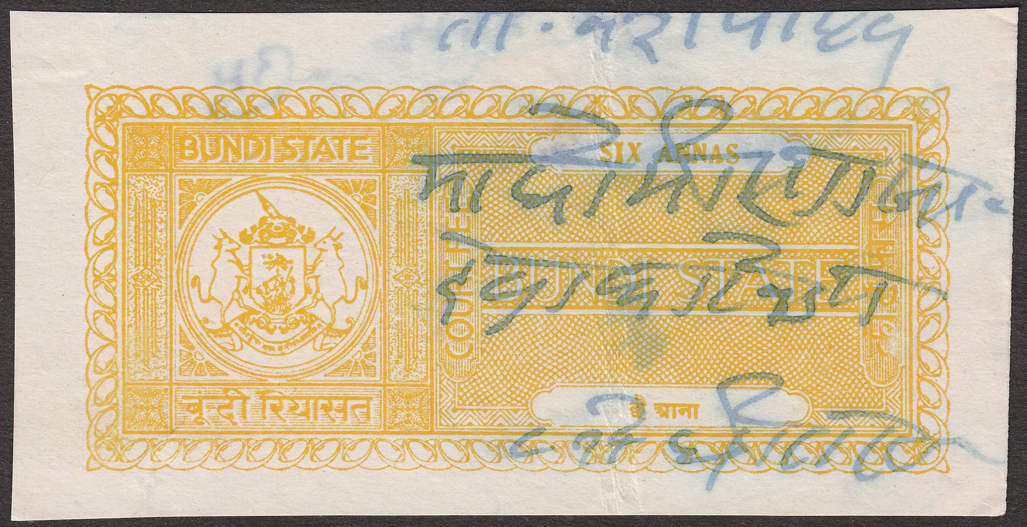 Diese Gebührenmarke "COURT FEE" zu 6 Annas in gelb erschien in Bundi: