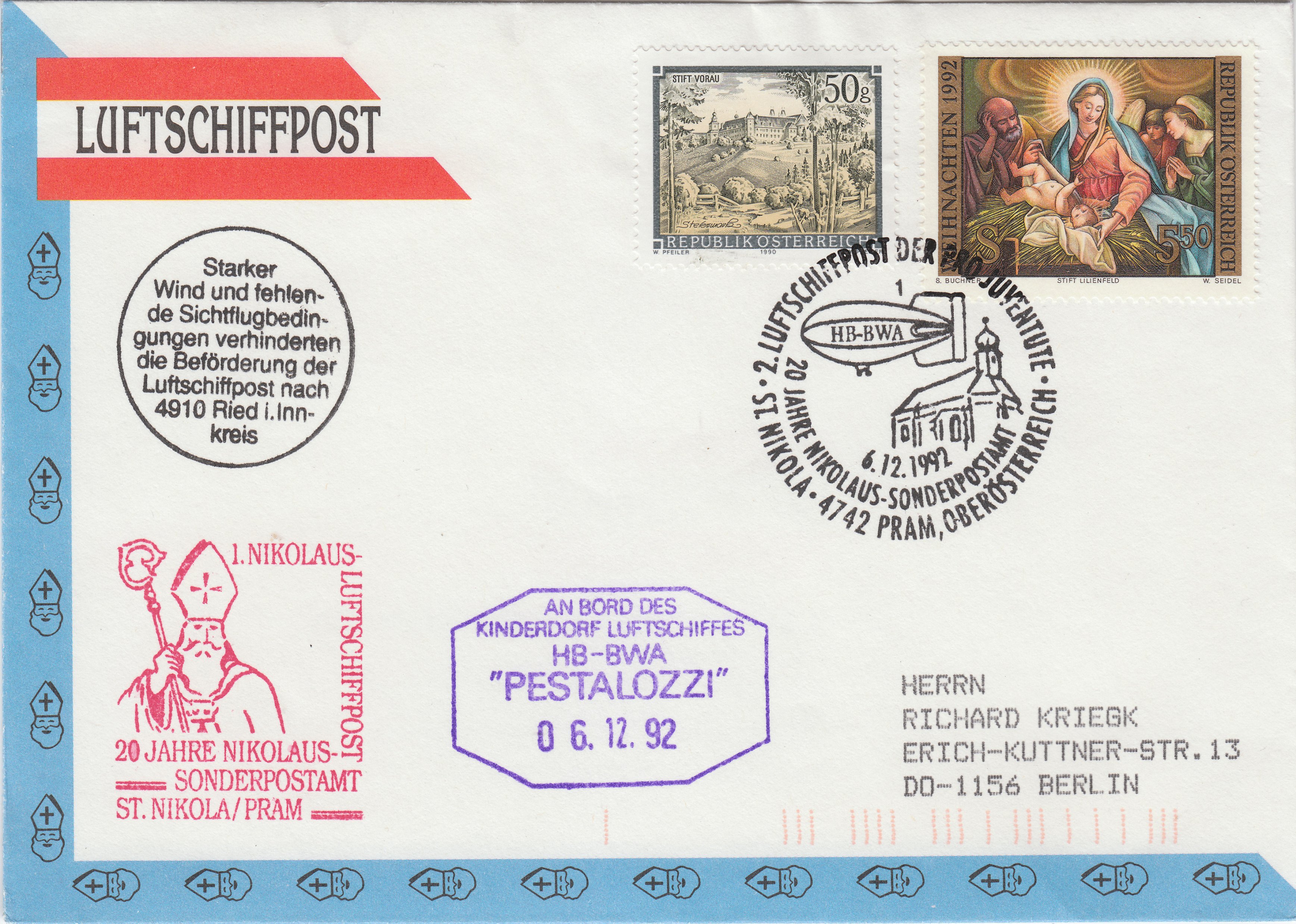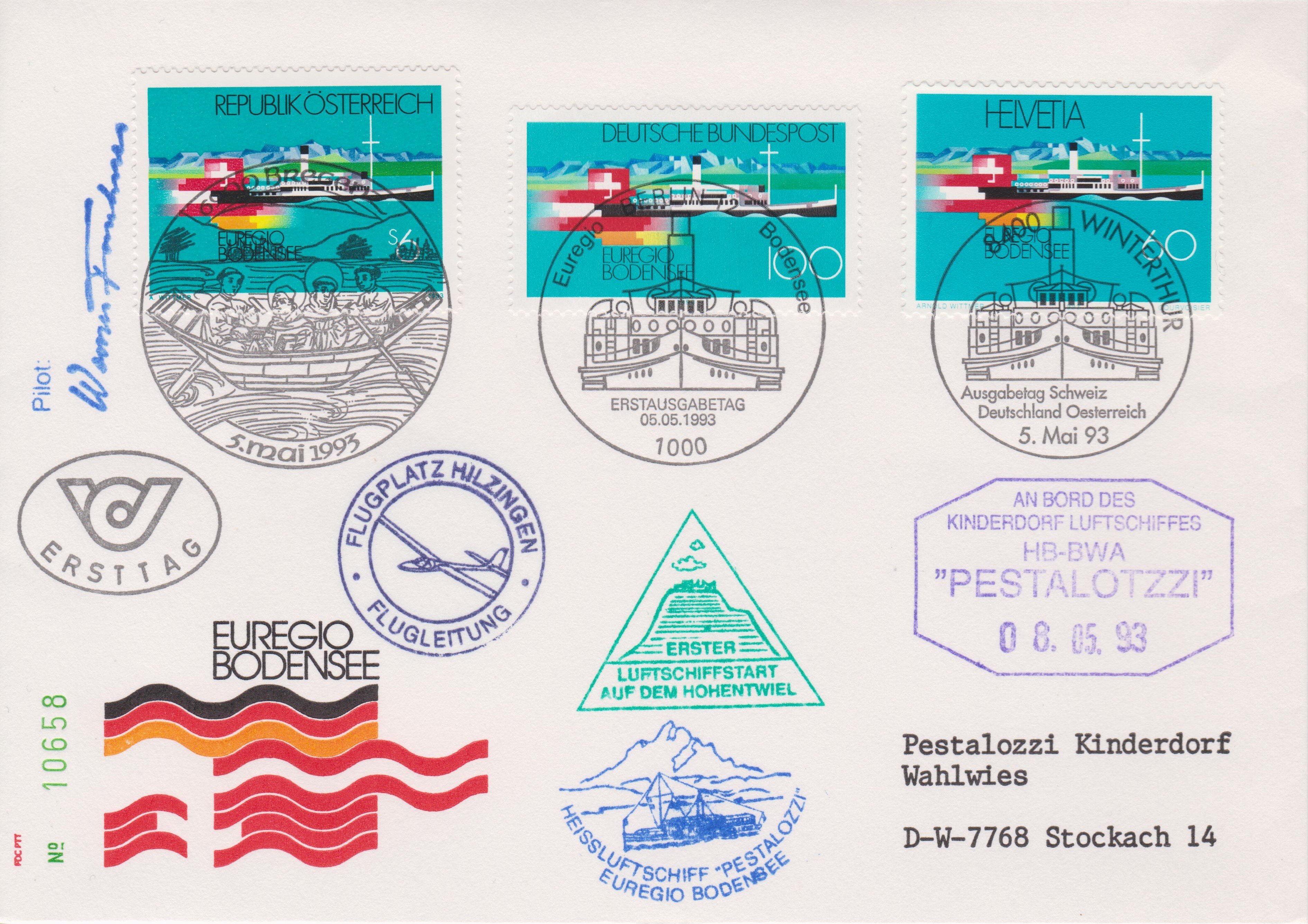 Die Jungfernfahrt von HB-BWA ''PESTALOZZI'' fand am 22.05.1992 in Graz als ''1. Luftschiffpost der Pro Juventute'' statt.