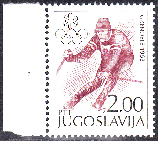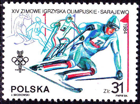 In einer Serie aus Polen zu den Olympischen Spielen in Sarajewo und Los Angeles erschien auch eine Marke (MiNr 2918) mit einem Skiläufer beim Spezialslalom.