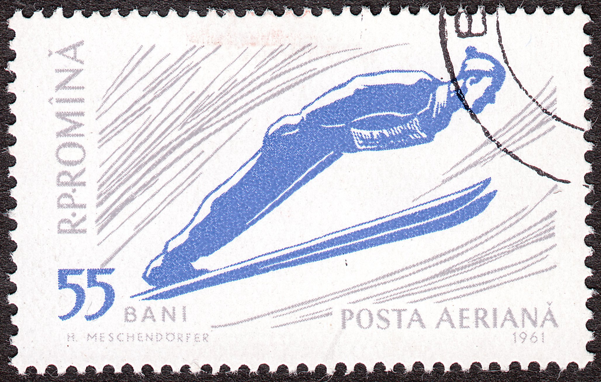 Hier noch ein rumänischer Skispringer während der Flugphase, passender Weise auf einer Luftpostmarke:
