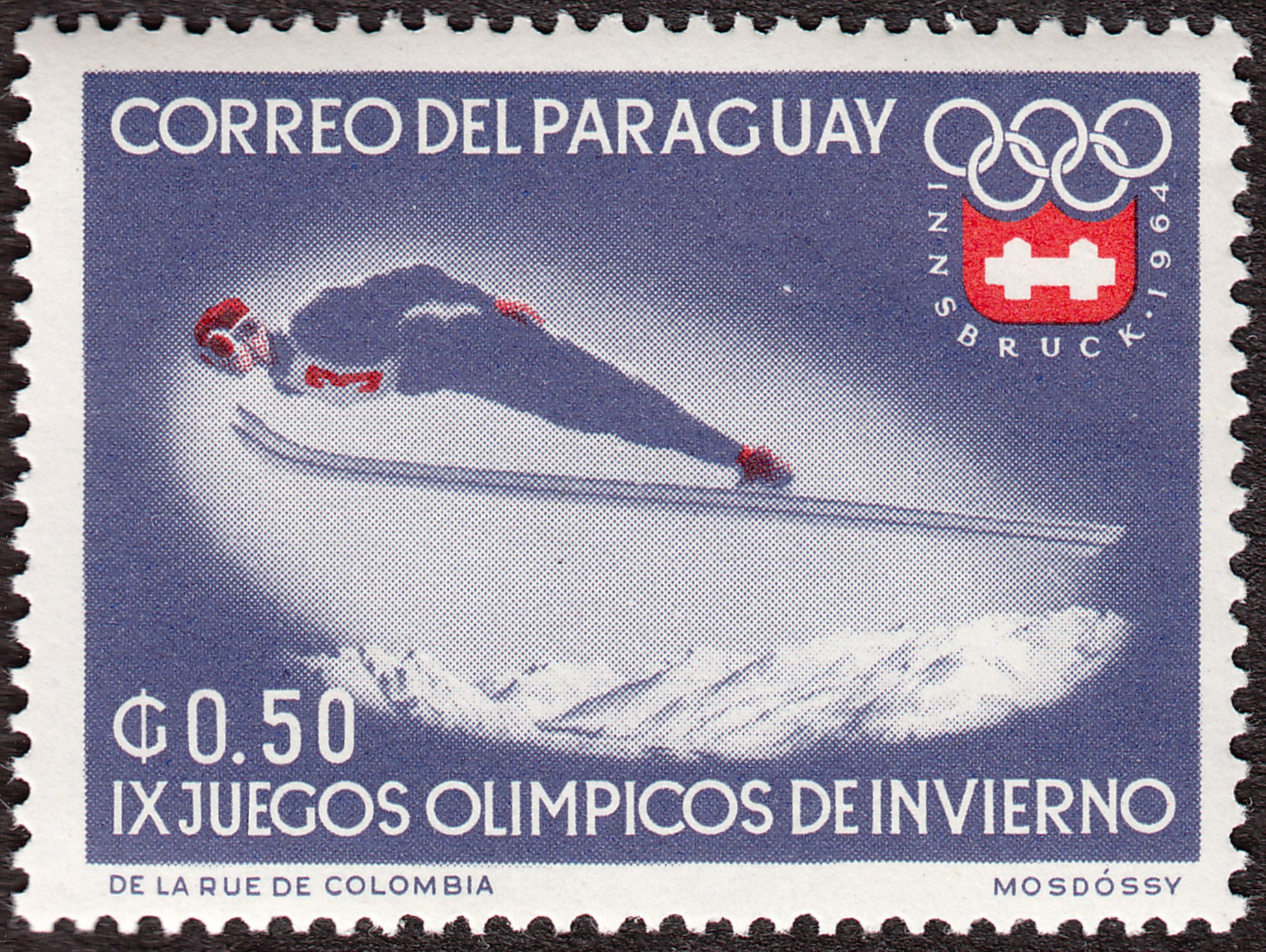 Zu den Olympischen Winterspielen 1964 in Innsbruck erschien in Paraguay diese Marke mit dem Motiv eines Skispringers während der Flugphase: