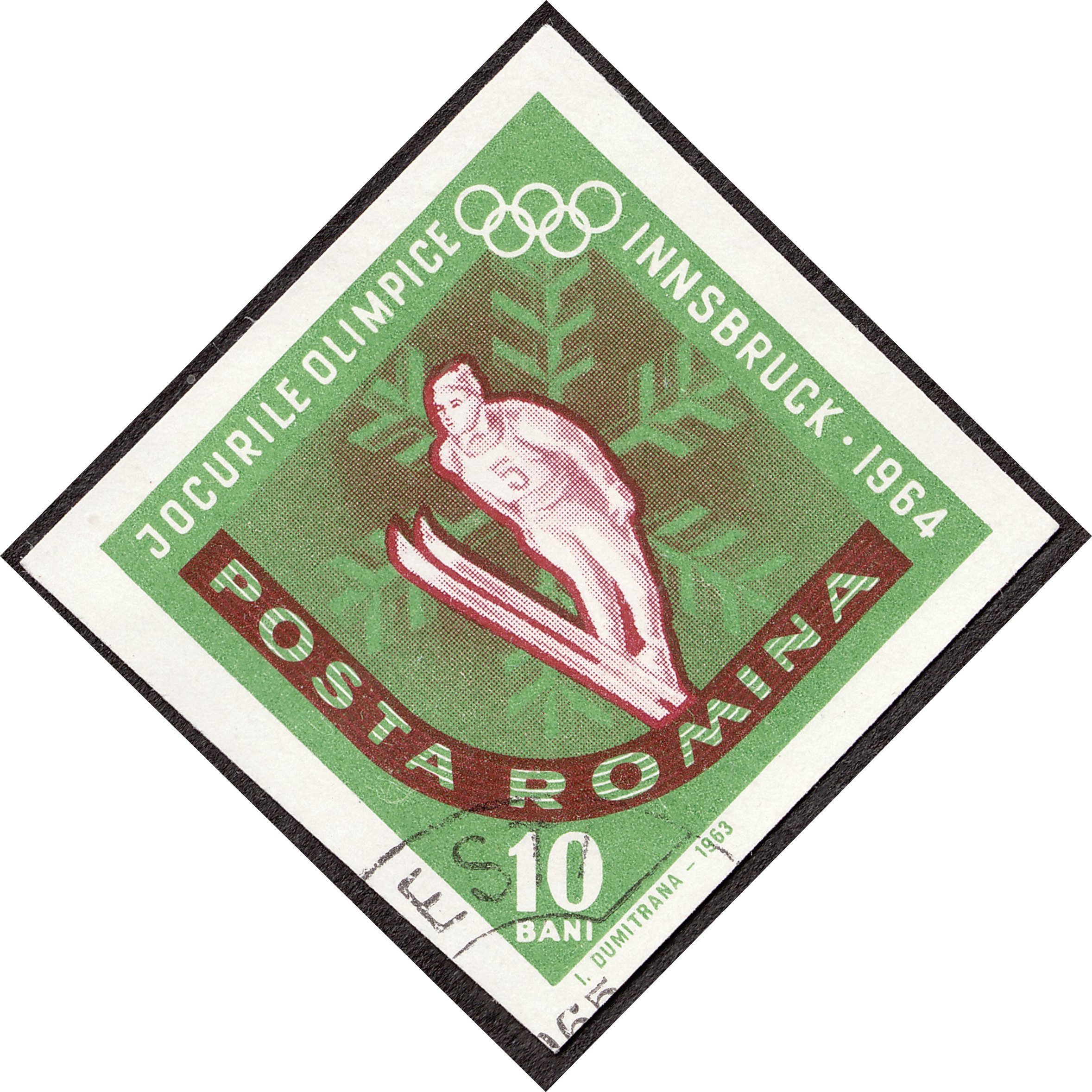 Zu den Olympischen Winterspielen 1964 in Innsbruck erschien in Rumänien diese Marke mit dem Motiv eines Skispringers während der Flugphase: