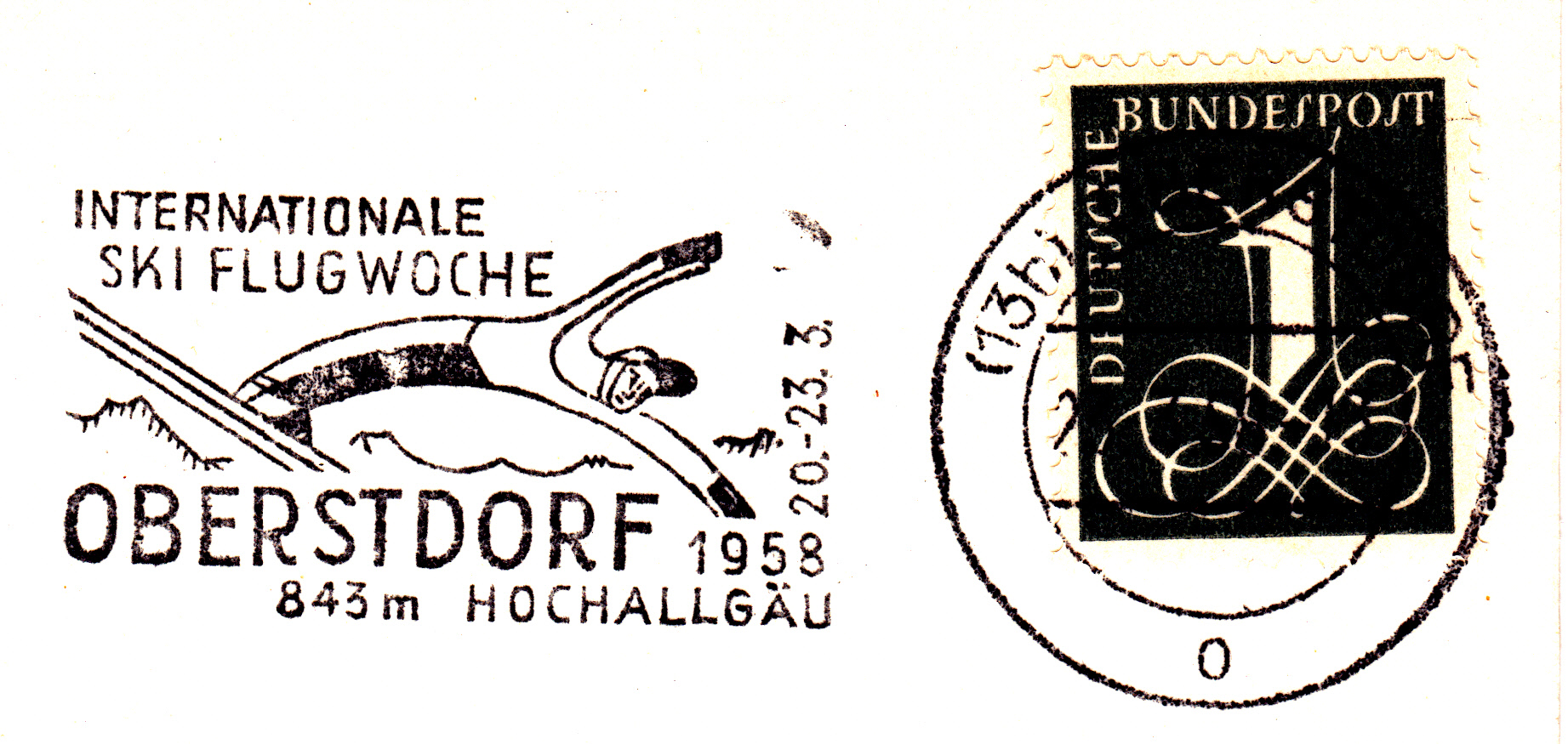 Maschinenwerbestempel aus Oberstdorf zur Internationalen Skiflugwoche vom 20. bis 23. März 1958.