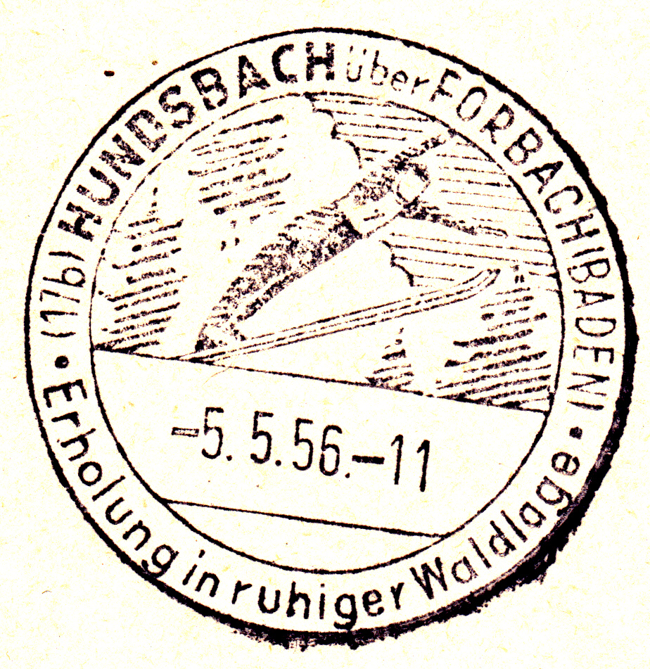 Dieser Handwerbestempel aus Hundsbach über Forbach(Baden) vom 5.5.1956 zeigt im Bild einen Skispringer, der im Stil der damaligen Zeit (Ski parallel, Arme nach vorne) springt.