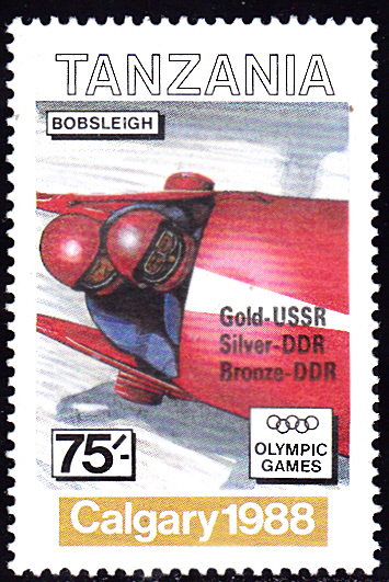 Eine Marke mit Aufdruck aus Tansania (MiNr 600) nennt diese drei Medaillengewinner.