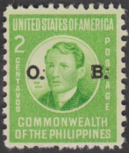 Philippinen Dienstmarke MiNr. 38 erschien am 14.04.1941, indem die Freimarke MiNr. 439 I mit einem Buchdruck-Aufdruck "O. B." versehen wurde.