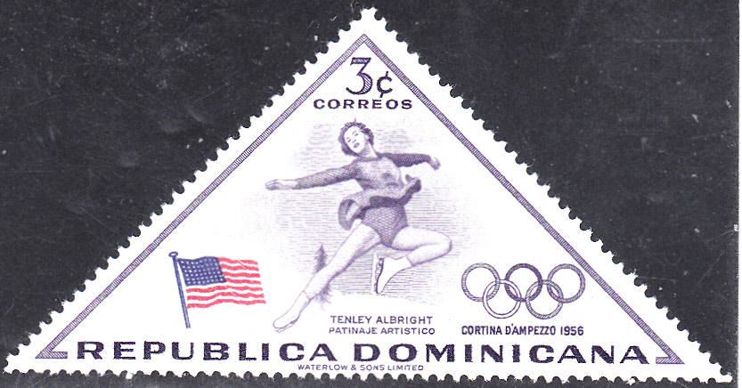 Auf dieser Marke aus der Dominikanischen Republik (MiNr 615 A) ist Tenley Albright, eine ehemalige US-amerikanische Eiskunstläuferin, abgebildet. Sie wurde 1956 im Eiskunstlauf der Damen Olympiasiegerin.