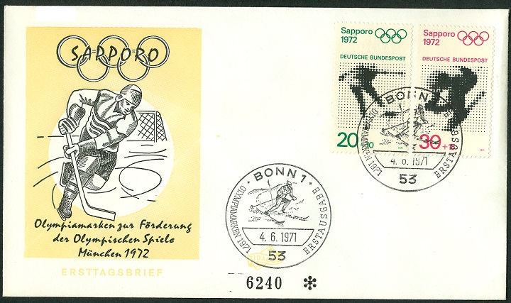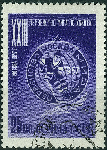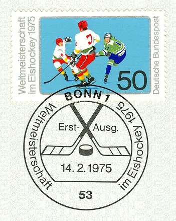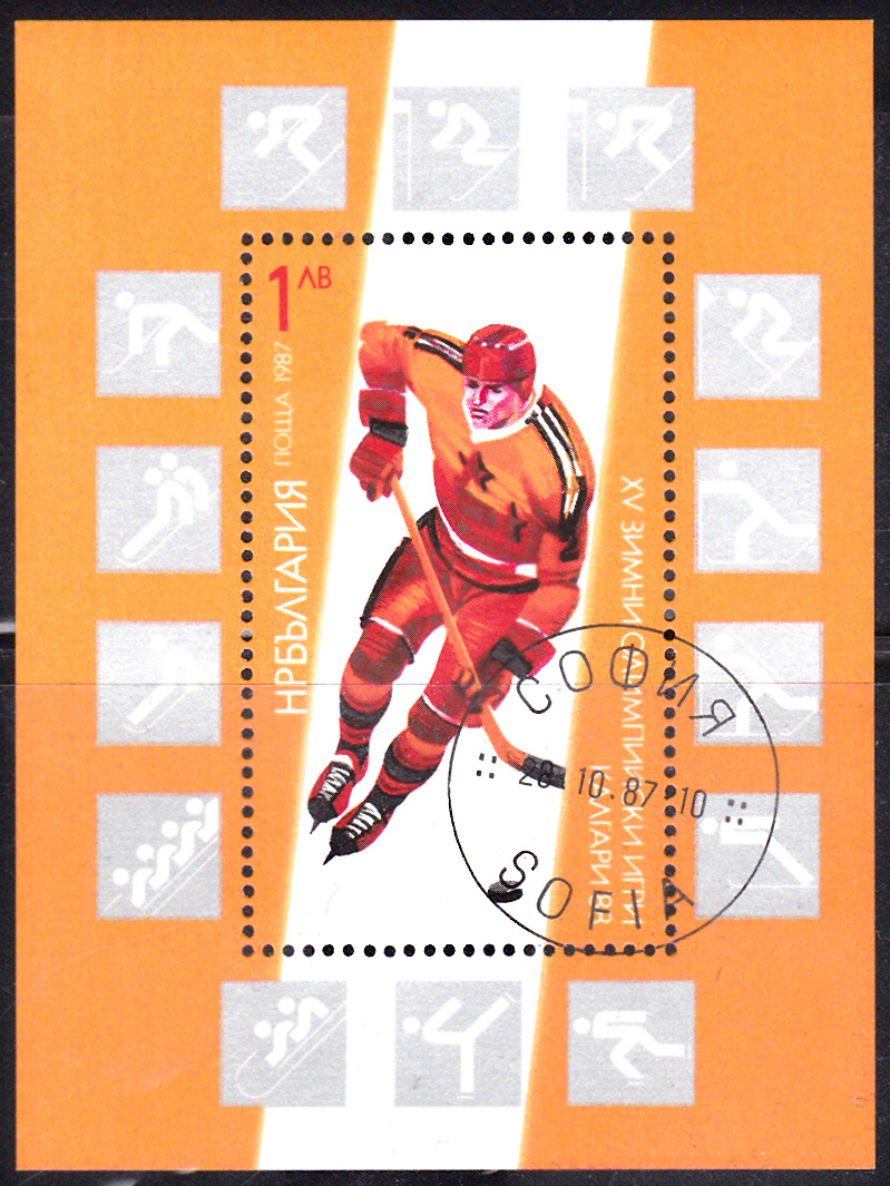 Auf dieser Marke aus Kanada (MiNr 1012) zu den Olympischen Spielen in Calgary 1988 ist bei genauer Betrachtung ein Eishockeyspieler zu erkennen.
